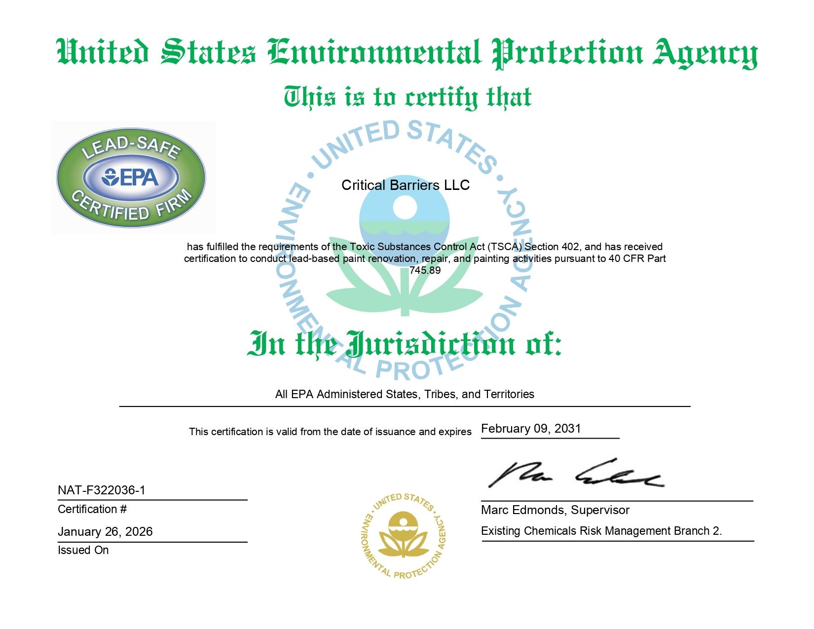 Critical Barriers LLC operates with a commitment to professionalism, transparency, and strict adherence to Texas environmental and building standards. The company provides licensed inspections, mold and hazardous-material protocols, containment design, and remediation oversight tailored to both residential and commercial environments. Each project is documented thoroughly, executed methodically, and supported by clear reporting that meets state requirements and provides clients with confidence in the work performed.